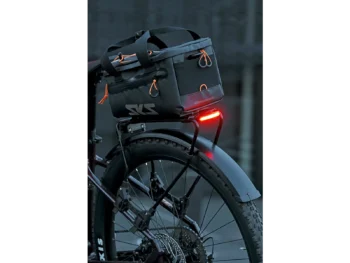 Tehokas ja minimalistinen: litteä INFINITY UNIVERSAL -TAKAVALO parantaa näkyvyyttä. Takavalo voidaan helposti kiinnittää INFINITY UNIVERSAL -tavaratelineeseen mukana toimitetun adapterin avulla.